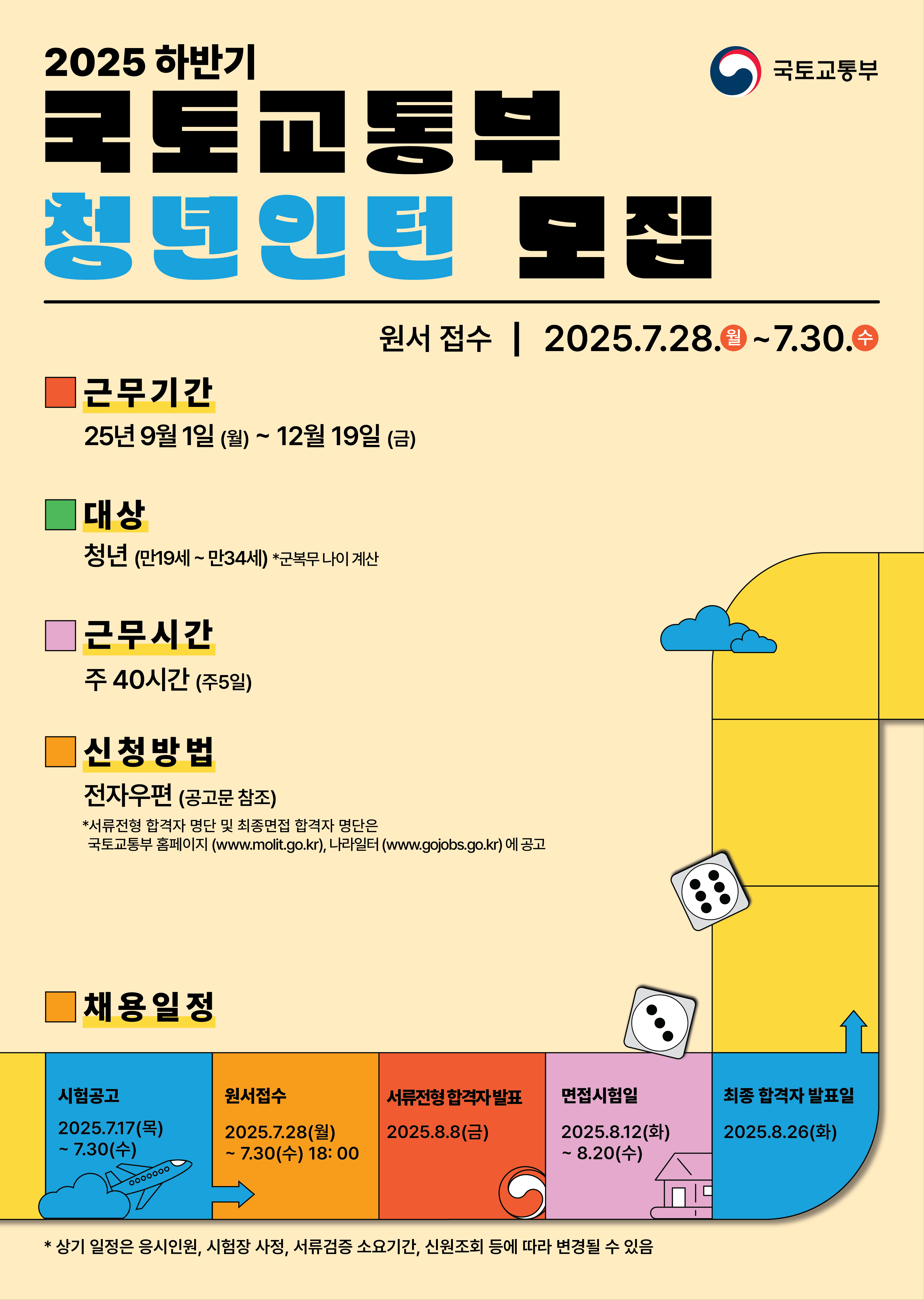 국토교통 업무에 관심있는 청년(만 19세~34세)이라면 누구나 지원이 가능하며, 7월 17일부터 7월 30일까지 시험 공고하고, 7월 28일부터 30일 18시까지 3일간 원서접수 후 서류 전형 및 면접시험을 거쳐, 8월 26일 최종 합격자를 발표할 예정이다.