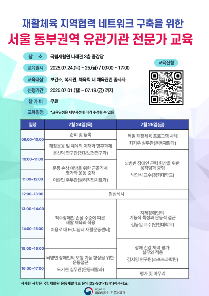 교육은 국립재활원 나래관 3층 중강당에서 진행되며, ▲재활운동 및 체육의 이론과 과제 ▲손상 예방을 위한 평가 및 운동 중재 ▲장애유형별 재활체육의 적용 ▲해외 재활체육 사례 소개 등 현장 중심의 맞춤형 교육과 실제 사례를 바탕으로 한 교육 프로그램이 운영된다.